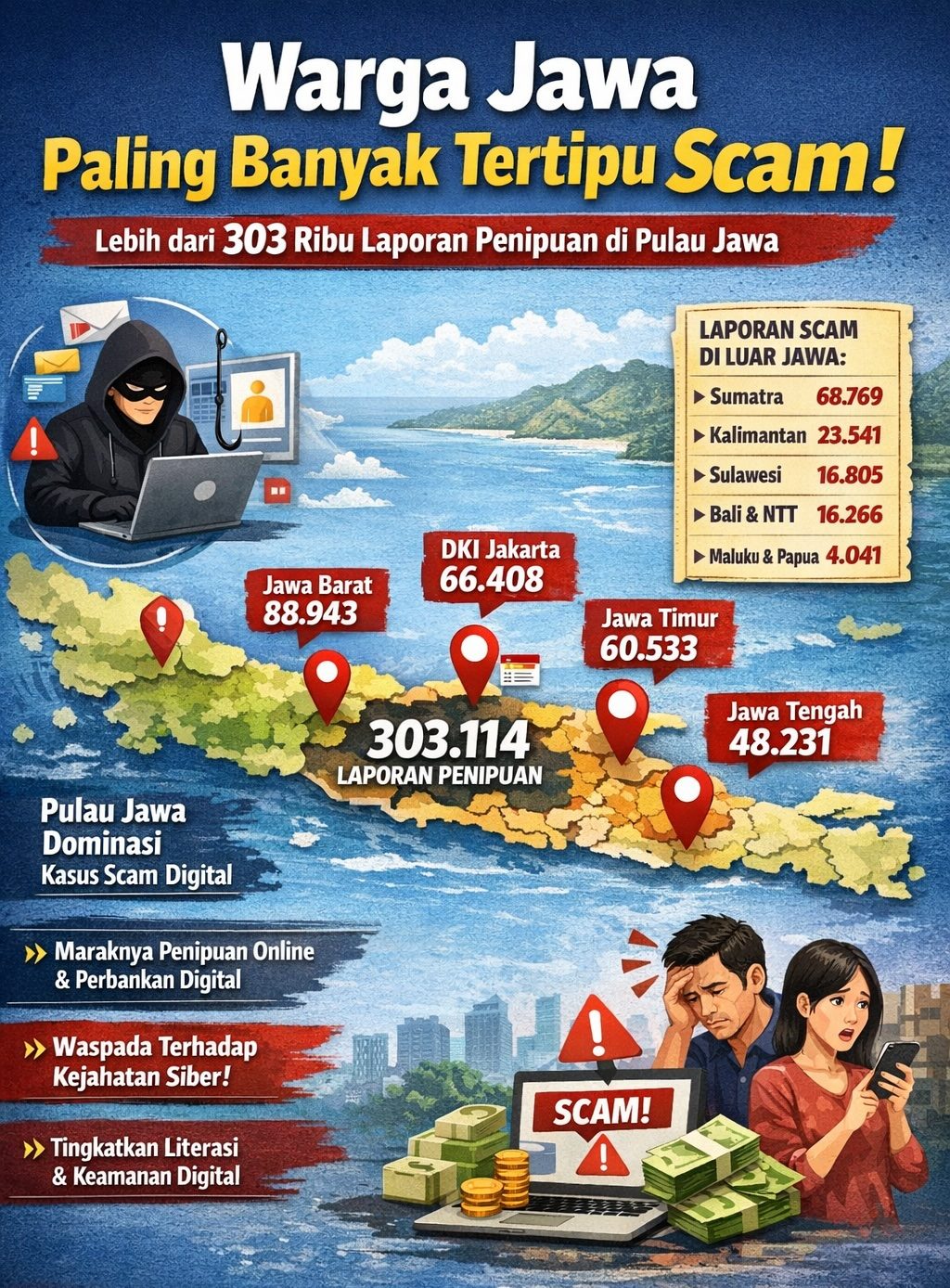 Jakarta, VivaNusantara — Kasus penipuan digital (scam) di Indonesia terus meningkat dengan sebaran korban yang didominasi wilayah Pulau Jawa. Data Otoritas Jasa Keuangan (OJK) melalui Indonesia Anti-Scam Center (IASC) menunjukkan lebih dari 303 ribu laporan penipuan berasal dari pulau dengan jumlah penduduk terbesar di Indonesia tersebut.