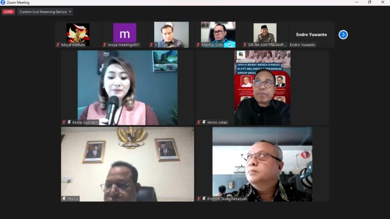 Guna membahas masalah tersebut, sejumlah pengamat dan tokoh hadir pada acara webinar nasional yang diselenggarakan oleh Moya Institute dengan tema “Upaya Benny Wenda Kandas di KTT Melanesian Spearhead Group (MSG)”, Jumat (22/9) sore.