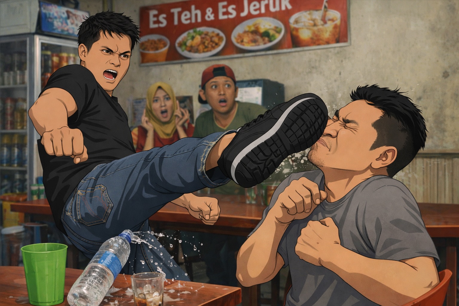 Dalam kondisi emosi, pelaku kemudian menendang wajah korban yang saat itu sedang duduk. Tendangan mengenai bagian mata korban dan menyebabkan luka.