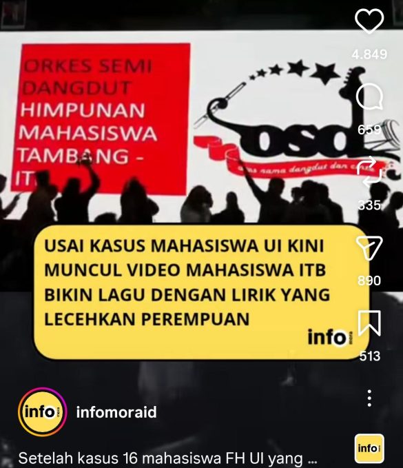 Samarinda, VivaNusantara – Video penampilan Orkes Semi Dangdut (OSD) Himpunan Mahasiswa Tambang (HMT) Institut Teknologi Bandung kembali memantik kegaduhan publik. Lagu berjudul “Erika” yang mereka nyanyikan ramai-ramai viral di platform X, bukan karena musikalitasnya, tetapi karena liriknya yang vulgar dan sarat objektifikasi terhadap perempuan.