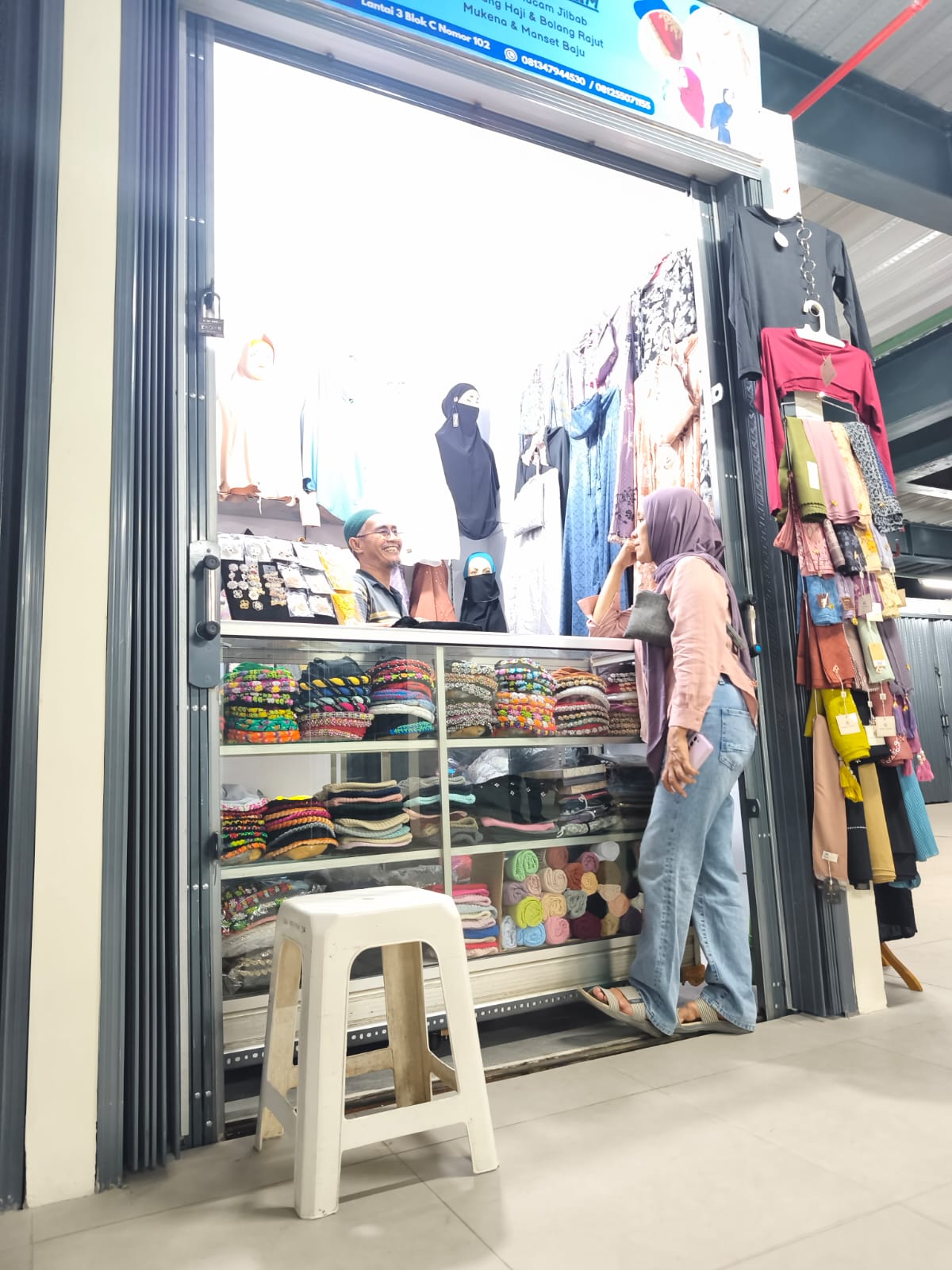 Di salah satu sudut lantai tiga, seorang lelaki paruh baya tampak telaten menata dagangannya, jilbab dan mukena disusun rapi di dalam kios sederhana berukuran 2 kali 2 meter. Sesekali ia berhenti, memandang lorong pasar yang masih sepi, lalu kembali bekerja. Wajahnya menyimpan optimisme, berharap langkah-langkah pengunjung akan kembali ramai, seiring kios-kios lain mulai terbuka.
