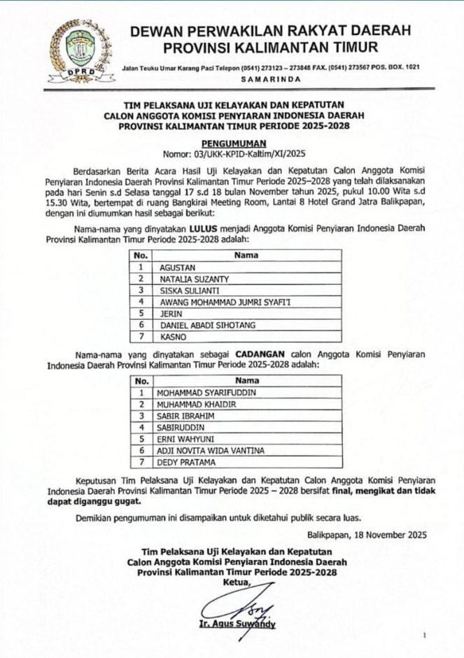 Berdasarkan hasil uji kelayakan yang berlangsung pada 17–18 November 2025 di Hotel Gran Jatra Balikpapan, sebanyak tujuh peserta dinyatakan lolos sebagai calon anggota KPID Kaltim. Mereka dinilai memenuhi syarat kompetensi, integritas, serta pemahaman terhadap regulasi penyiaran daerah.