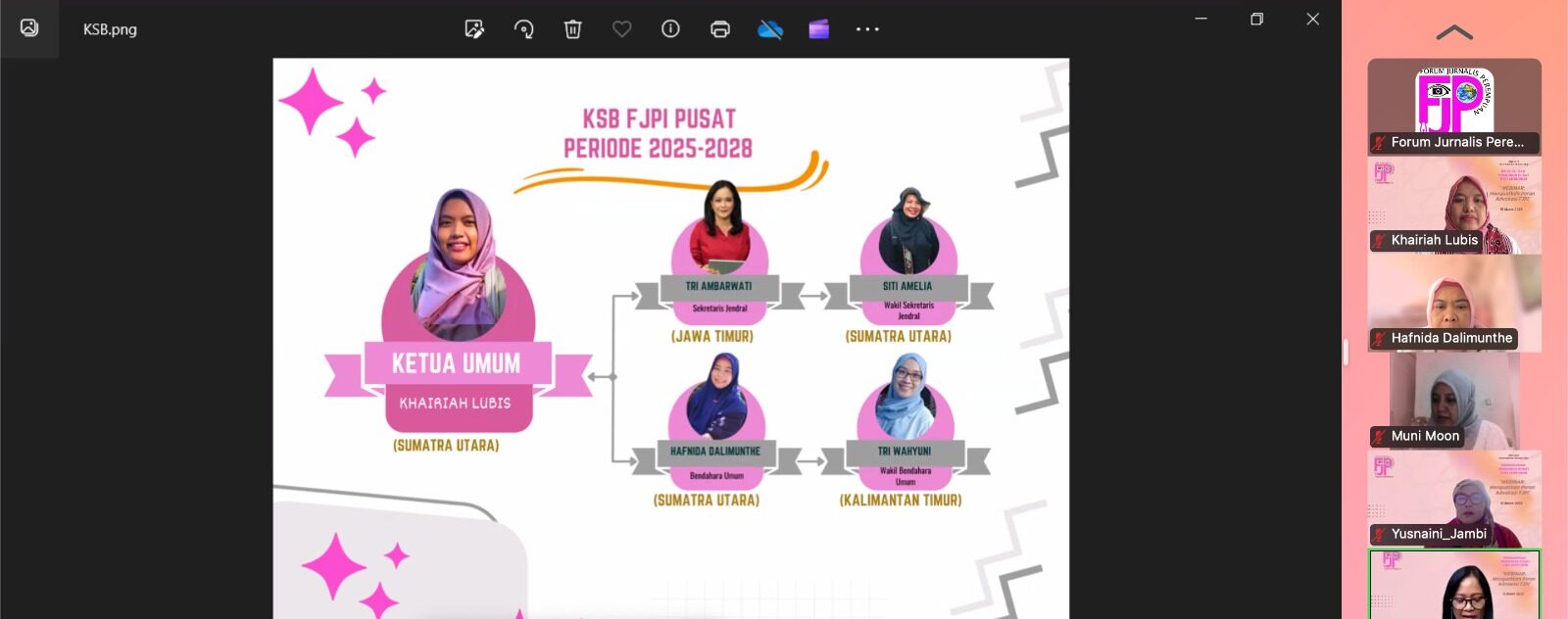 Samarinda, VivaNusantara- Pengurus pusat Forum Jurnalis Perempuan Indonesia (FJPI) periode 2025-2028 resmi dikukuhkan pada, pada Sabtu (15/3/2025) secara daring. FJPI sendiri merupakan organisasi yang menjadi wadah untuk pengembangan kapasitas serta memperkuat peran advokasi para jurnalis perempuan di Indonesia selama 17 tahun ini.